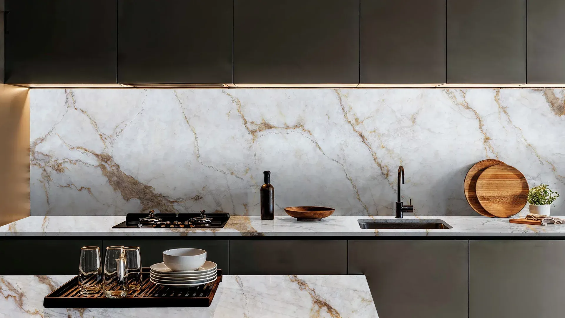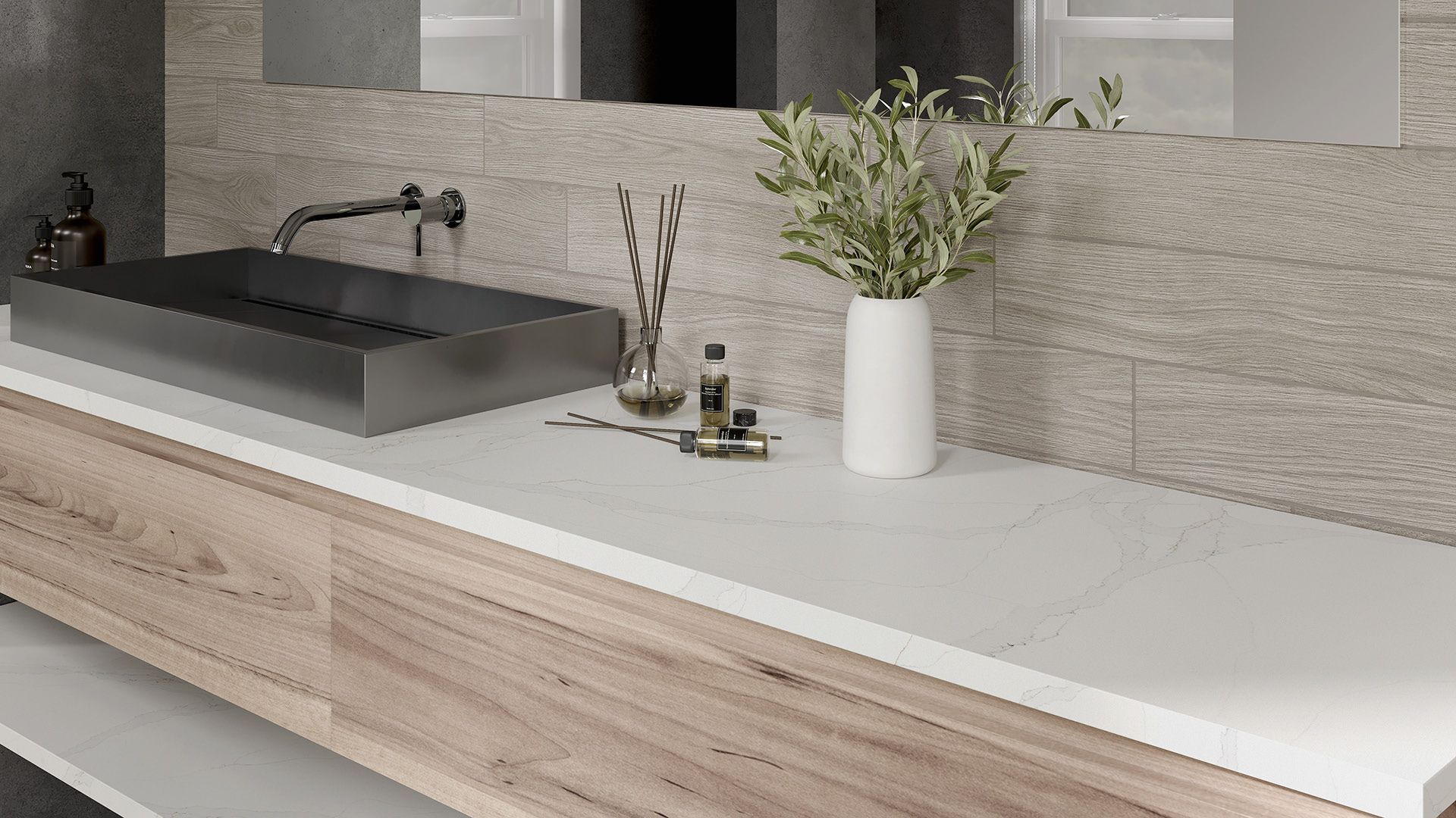 Stílhreinn quartz-steinn með áberandi grám marmaraæðum sem skapa djúpt og kraftmikið útlit. Fullkominn fyrir nútímaleg og dramatísk rými.